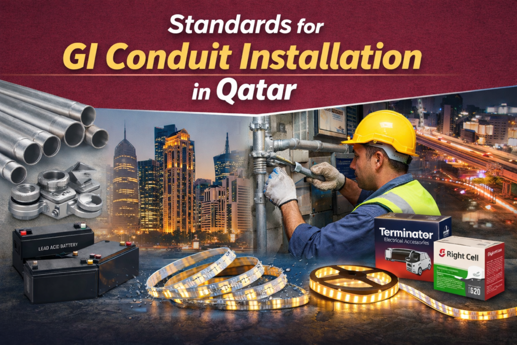 Qatar’s electrical projects often specify premium electrical brands to ensure performance and longevity. Products from Bright Cell are widely used for energy storage and electrical reliability, while Terminator accessories support secure connections within GI conduit systems.